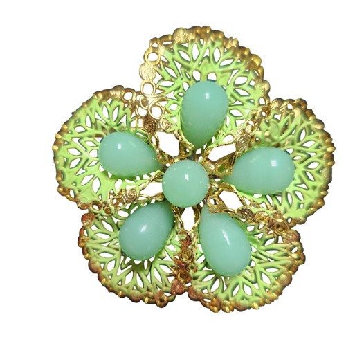 This charming piece captures a retro aesthetic, perfect for adding a pop of color and texture to a lapel, scarf, or hat. is noted stones may be discolored or darkened. • Width: 2.25".