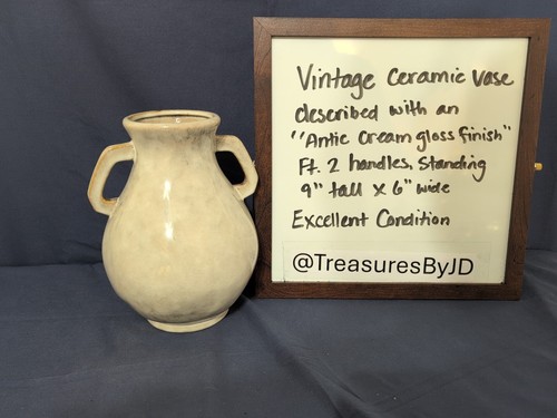 This VTG Ceramic Vase features a distinct antique cream gloss finish and is adorned with two handles for easy carrying. With dimensions of 9"x6", this original piece is perfect for all occasions and is made of ceramic material. The elegant design and color make it a beautiful decorative collectible that can be enjoyed by adults in any home setting. * Not for food purposes*