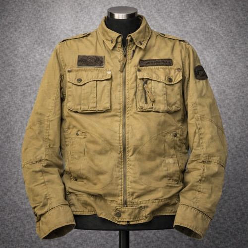 Beige utility jacket with multiple cargo pockets and military design. • Overall condition:[Good]. WHY YOU’LL LOVE IT. • Flaws (if any): Small scuffs and holes. Best fit:[S-M].