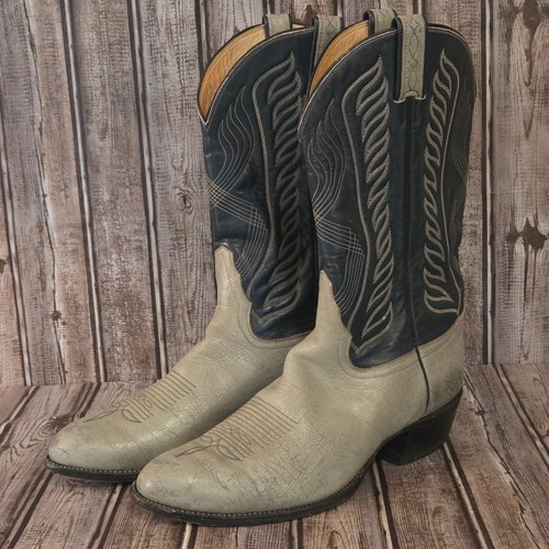 *There are some scuffs on the toes and heels. *Marked size 13D(US Men's) Classic Tony Lama western boots featuring a striking two-tone design with a gray antelope leather foot and a deep navy blue shaft. The shafts are decorated with intricate multi-row flame-style contrast stitching and integrated pull tabs with diamond embroidery. Designed with a traditional pointed toe and a stacked cowboy heel, these boots offer a rugged yet refined aesthetic. The leather shows natural character and some scuffing consistent with authentic wear.