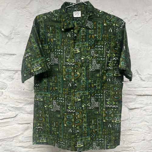 Vintage Hawaiian Surf Pacific Sportswear Shirt Green Loop Collar 50s 60s. Fabric feels like cotton or a cotton blend, loop/camo collar closure, gold tone coin buttons. No size tag, listed as medium, see below for best fit. approx measurements pit to pit: 20” collar seam to hem: 29” Item is pre owned. Really excellent nearly new condition, no fading or signs of wear. Colors are vibrant and deep, no stains holes or other flaws. You won’t be disappointed with the condition. Please refer to photos for detail.