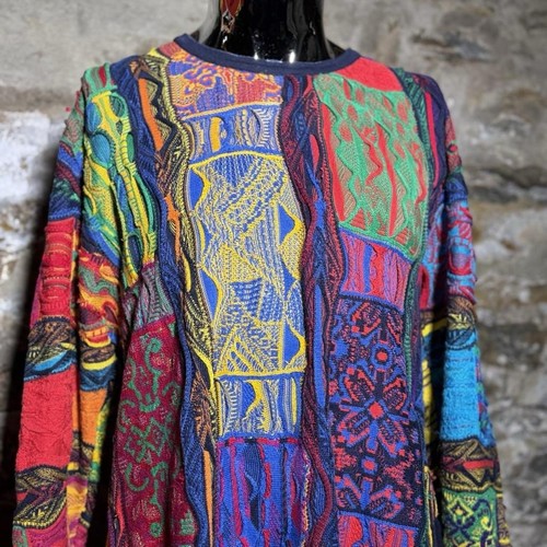 Vintage 90s Coogi black blue red yellow green coogi sweater Size medium 24”x28” Has some loose threading by one of the arm pit Lighter weight, split in the middle and does not hug the waist.