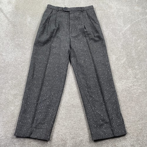 These pants feature a high-rise silhouette with double pleats, side pockets, and a straight-leg cut. The fabric has a classic speckled appearance, perfect for a sophisticated academic or professional look.