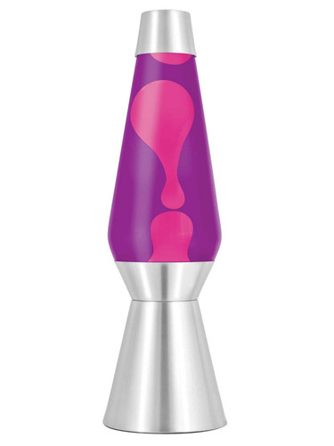 Pink wax / purple liquid / silver base & cap. Aluminum base. 100 watt reflector light bulb included.