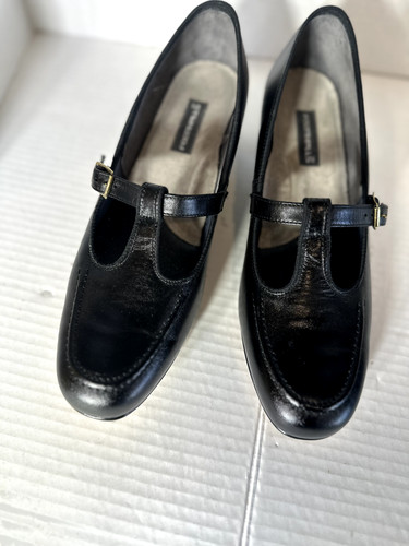 Elevate your shoe collection with these beautiful Footthrills T-strap Mary Jane heels. The black leather upper with strap accents and almond toe shape give these heels a classic look that is perfect for any occasion. The buckle closure ensures a secure and comfortable fit for all-day wear. These Mary Janes feature a medium block heel, measuring at 1.5 inches, making them perfect for both casual and dressy occasions. The leather outsole and vintage style add to the durability and charm of these USA-made heels. Add these to your wardrobe and step out in style.