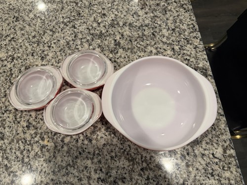 The Vintage PYREX 3 FLAMINGO PINK 8 Oz MINI BOWL with Lid and 24 Oz Casserole Bowl is a charming set of mid-century modern serving bowls. Made of glass and ceramic, the pink flamingo design adds a touch of retro style to your table setting. The set includes a mini bowl with a lid, perfect for serving snacks or desserts, along with a larger casserole bowl for serving main courses. With its vintage appeal and vibrant pink color, this PYREX collection is sure to be a conversation starter at any meal. 24 Oz has imperfections. No returns. All sales are final.