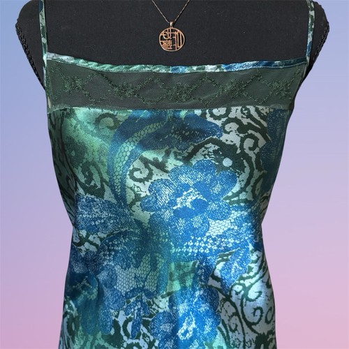This Vintage 90s Whimsigoth Blue Green Silk Satin Printed Slip Dress in Women's size 6 features a floral pattern, square neckline, and sleeveless design. Made from a lightweight silk blend fabric with lace accents, this knee-length dress is perfect for the Summer and Spring seasons. The combination of blue, green, and black colors adds a whimsical touch to this chemise-style dress from the brand delicates, making it a unique and stylish addition to any woman's wardrobe.