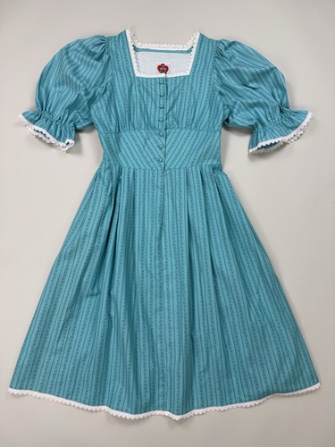 This beautiful traditional-style dress features a fitted bodice with decorative buttons, a flattering high waist, and a full skirt. The fabric has a classic vertical stripe with small floral motifs, typical for Alpine traditional clothing.