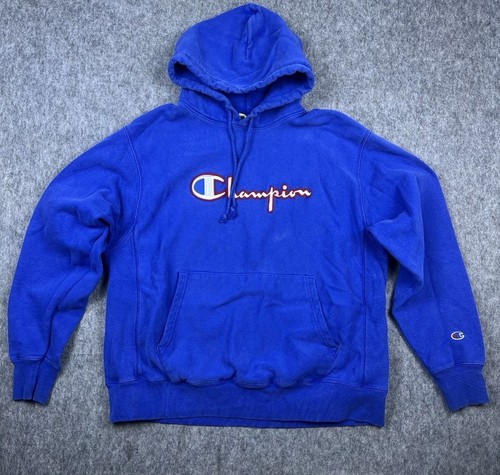 Vintage Champion Men's Reverse Weave Hoodie Sweatshirt Blue Logo Size Large. Condition is Pre-owned - Good. Shipped with USPS Ground Advantage.