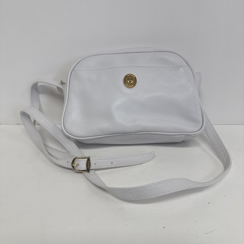 The Vtg 80s Etienne Aigner Shoulder Bag is a classic white leather crossbody handbag with a solid rectangle shape. This vintage piece features a white shoulder strap and gold hardware, perfect for adding a touch of elegance to any outfit. The interior is lined with fabric and includes inner pockets for organization, making it both stylish and functional. Ideal for women looking for a timeless accessory with a hint of retro charm, this Etienne Aigner handbag is a must-have addition to any wardrobe.