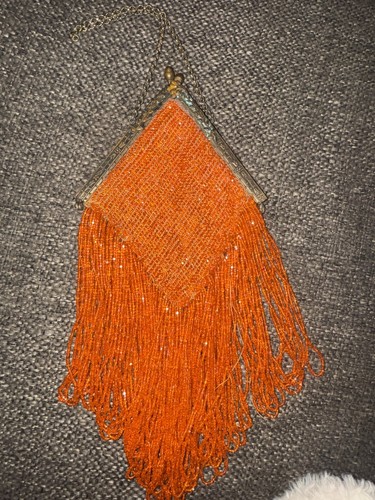 Vintage beaded flapper-style purse in a vibrant orange color. Features detailed glass beadwork with long fringe and a classic metal frame with chain strap. Great statement piece with beautiful movement. Measurements: • 4 3/4 inches wide • 11 inches long (including fringe) • 6 inch strap drop Condition: Very good vintage condition. Beadwork is intact with minimal wear. Fringe is full and even. Frame and clasp work properly. A standout vintage piece perfect for display or wear.