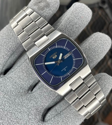 The product is a vintage Seiko 5 Automatic Cal 6309 wrist watch from Japan, with a square case shape and a blue sunburst dial. It features a mechanical automatic movement with 17 jewels, a stainless steel case and bracelet band, and stick indexes on the dial. The watch has a left-handed design, day/date features, and a polished silver case finish. With a vintage style and a size of 37mm x 37mm x 11mm, this Seiko 5 watch is a classic and stylish accessory for men.