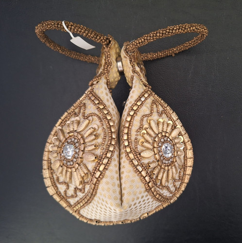 Features a floral design with a large clear rhinestone center, beaded strap handles, and a magnetic snap closure. Condition as shown in photos.
