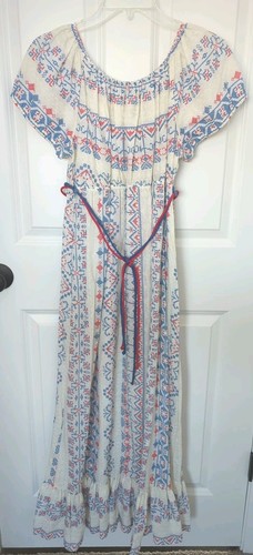 This Vintage Boho Peasant Gypsy Maxi Dress features a cross stitch pattern and a prairie folk style, perfect for everyday wear in the 60/70's. Made of cotton with a boho look, this original dress has a chest size of 22 inches across and a shoulder to hem length of 53 inches. The dress is in a regular size with an empire waist and showcases a maxi length, making it a unique and stylish choice for any vintage-loving woman's wardrobe. Made in the United States, this dress is a versatile addition to any collection of women's vintage clothing.
