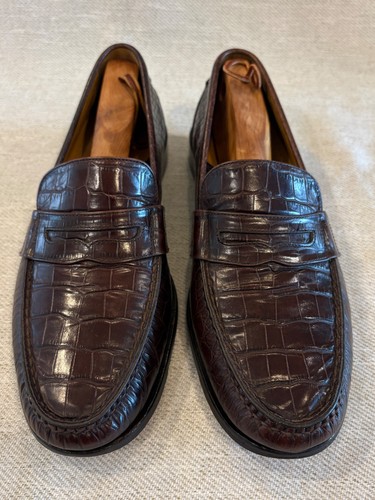 Perfect for an "Ivy League" or "Dark Academia" aesthetic, these are a staple for any wardrobe. Alligator Print Loafers. Color: Dark Brown / Mahogany. The embossing is crisp with no cracking or deep scuffs.