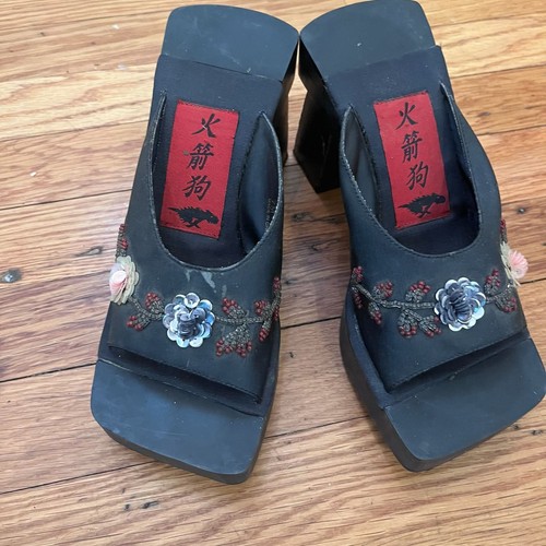 Vintage Rocket Dog platform sandals from the Y2K era. Black fabric upper with beaded floral embroidery and sequins. Square toe design with a chunky block heel and platform. Size 7M. Signs of wear on the insoles and light scuffing on the soles. Red logo tag detail on the heel bed.