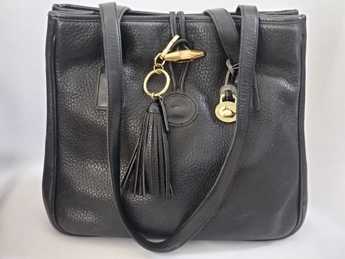 Dooney & Bourke black pebbled All Weather Leather tote-style purse with brass hardware, approx. The Buxton fob may not be original but I don't know.