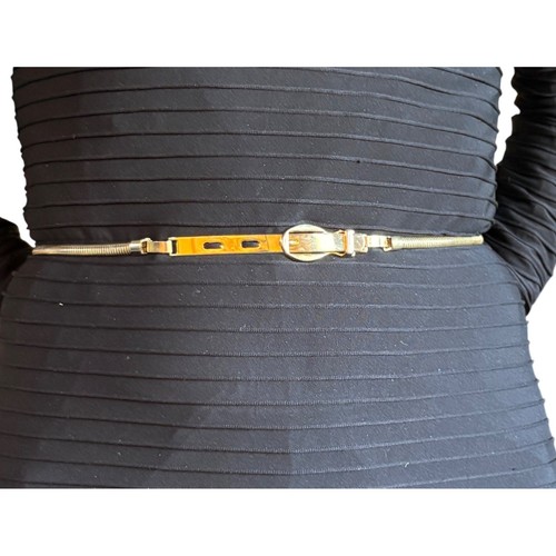 The front is detailed with a polished buckle closure and a small textured plaque, adding a touch of classic sophistication to any ensemble. Style: Skinny Snake Chain. Texture: Ribbed Snake Chain. Closure: Buckle.