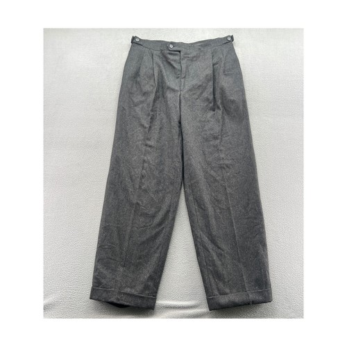 Vintage-style pleated trousers crafted from a heavy charcoal grey wool-blend fabric. These pants feature a classic wide-leg silhouette with cuffed hems and traditional side adjusters at the waistband for a custom fit. Designed with double pleats for added volume and comfort, they include side slit pockets and a button-through back welt pocket. The textured, melange-effect material provides a timeless aesthetic suitable for heritage or academic-inspired wardrobes. Measurements: • Waist: 17.5" (35" doubled) • Inseam: 29" • Rise: 13"