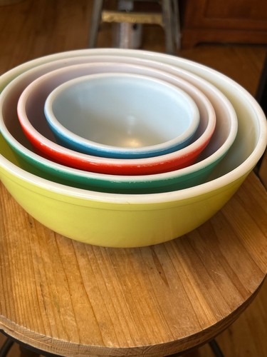 The Vintage Pyrex Primary Colors Nesting Mixing Bowls set of 4 is a charming addition to any kitchen, featuring a retro Mid-Century Modern style with a vibrant multicolor design. Made of durable glass with a glossy finish, these round bowls are stackable for easy storage. Originating from America in the mid-20th century, this original PYREX set includes four nesting bowls perfect for all occasions. These vintage Pyrex mixing bowls are a stylish and practical choice for adult cooks looking to add a touch of nostalgia to their kitchen decor.