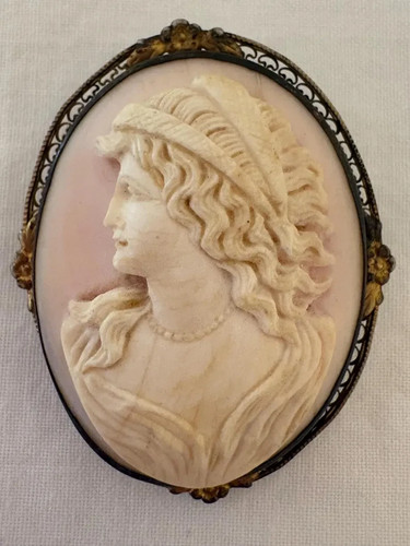 Featuring a classic lady profile in soft ivory tones set against a blush pink background, this piece captures the romantic charm of Victorian revival jewelry.