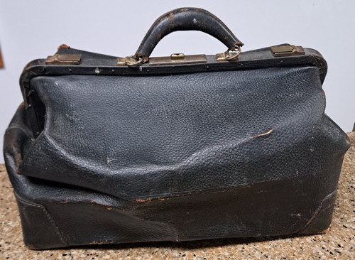 From an estate. was in a shed and the leather is dried out and cracking. the closers work. the only writing i could find on it is on the bottom that says genuine cowhide, and the numbers 528 1/2, 18.