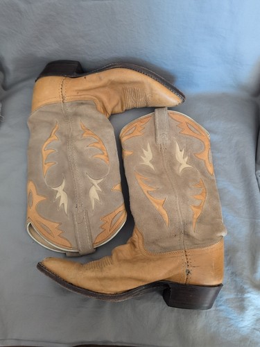 Style: Classic Western / Cowgirl. Design: Features a striking two-tone aesthetic with a smooth leather foot and a soft suede shaft. Color: Tan / Butterscotch Leather with Cream Suede Upper.