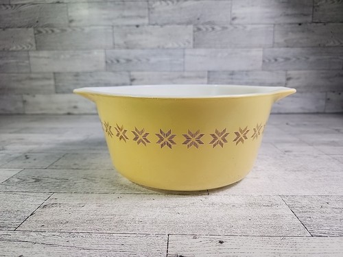 Some external wear but no chips or cracks. No lid. The Vintage Pyrex Yellow Cross Stitch Dish 474-B Town & Country 1.5 QT is a casserole dish made by PYREX in the United States. This 1.5 quart dish features a charming town and country pattern in a vibrant yellow color, adding a touch of nostalgia to any kitchen. The glass material and vintage nature make it a sought-after collectible for those who appreciate classic American cookware. Please note that this listing does not include the lid for the dish.