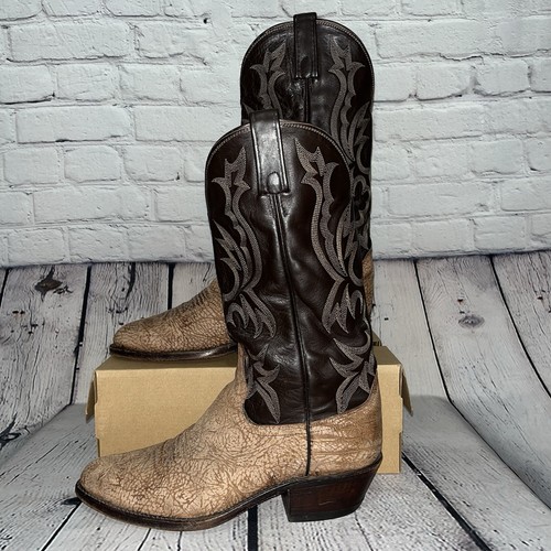 Shrunken Bull Shoulder Collection. Model: Western Shrunken Bull Shoulder. The shrunken bull shoulder leather on the vamp has a suede texture to it. Riders Heel or Cowboy Heel. Shaft is a chocolate brown Leather w/ Western Scroll Stitching on shaft & vamp.
