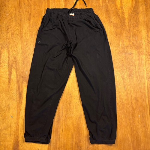 Russell Athletic black sweatpants in men’s size large. Features elastic waistband with drawstring, tapered leg with elastic cuffs, and minimal logo branding. Classic Y2K athletic style, great for casual wear or lounging. Good pre-owned condition.