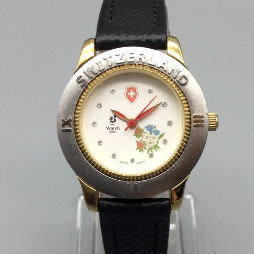 Dial: White dial with red Swiss shield logo below 12 o'clock, red hour and minute hands, red central seconds hand, clear stone-style dot indices, small logo with 'Watch' text near 8 o'clock, multicolor Swiss floral motif above 6 o'clock, and SWISS MADE text at the bottom edge as shown.
