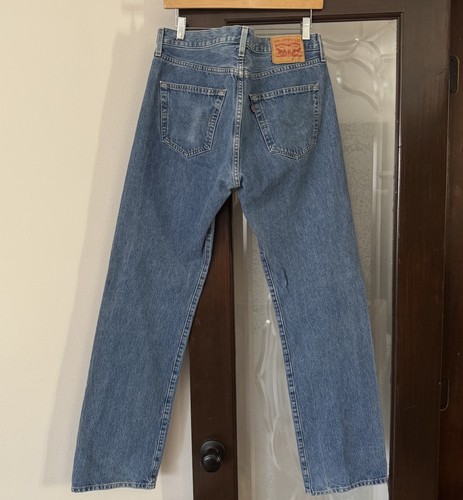 This product is a pair of Vintage Levi's 501 Men's Jeans in a classic light blue color with a waist size of 34 inches and inseam of 34 inches. Made of cotton denim, these jeans feature a button fly closure and copper rivets accents. The mid-rise fit and regular size make them a versatile and comfortable option for everyday wear. The straight leg style and five-pocket design add to the timeless appeal of these iconic Levi's jeans.