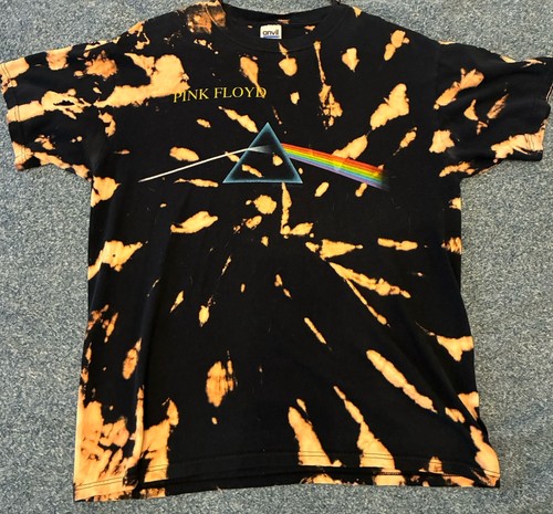 This vintage 90s Pink Floyd First In Space Dark Side Of Moon bleached dye shirt is a must-have for any fan of rock, Pink Floyd, and the Dark Side of the Moon. Made from 100% cotton with a graphic print design, this shirt features a crew neckline and short sleeves. The black shirt showcases the iconic Pink Floyd logo, making it a limited edition, double-sided piece that is perfect for wearing in the summer, fall, or spring seasons. Made by Anvil in the United States, this shirt is a unique addition to any collection of men's vintage clothing.
