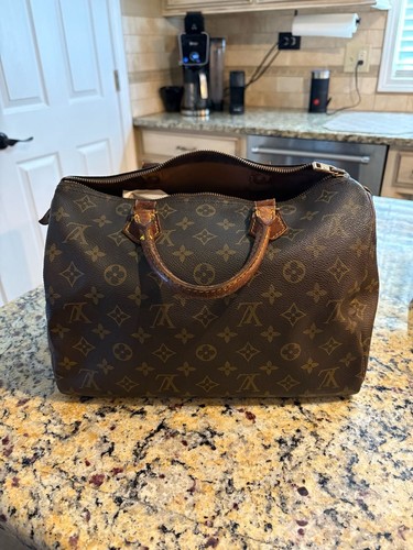 Classic monogram coated canvas with vachetta leather trim. Shows heavy patina and wear on handles and leather tabs. Interior fabric lining has some marks from use. Brass hardware has tarnishing consistent with age. Zip closure works but leather pull tab is missing. Great project piece for restoration or casual daily use.