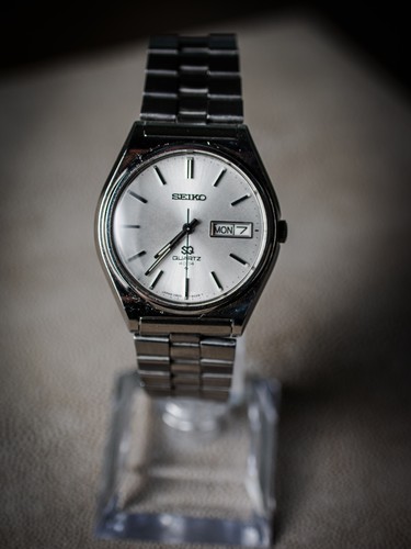 A Piece of Quartz History. This Seiko 4004 represents the era when Seiko was leading the world in quartz precision. The silver sunburst dial features applied baton indices and the iconic "SQ" (Seiko Quartz) logo above the 6 o'clock position.