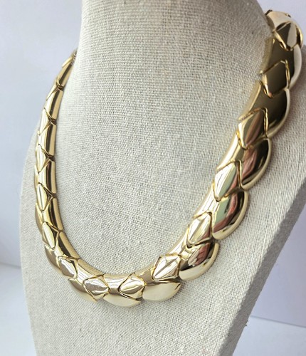 This vintage segmented "snake" type link collar / choker necklace features a wide gold tone design, perfect for adding a retro touch to any outfit. The lightweight construction makes it comfortable to wear. Ideal for those who appreciate unique and eye-catching jewelry from the 1980s-1990s. Good pre-owned condition, wasn't used much - the clasp is still pretty tight. See photos.