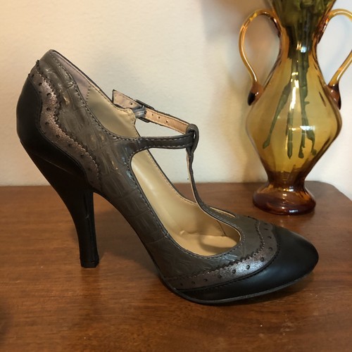 (See photos.). The rest of the faux leather seems to be in like-new condition. They feature a 3-in heel and adjustable T-strap buckle, with cute black, gray and silver detailing. The soles show very little sign of wear, and the interior appears to have never been worn.