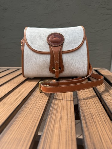 The Vintage Dooney & Bourke Essex All Weather Leather Essex Crossbody Bag in White is a medium-sized handbag crafted from high-quality leather. It features a solid pattern with a brass hardware material and comes with a detachable crossbody strap for versatile styling. The bag includes inner and outer pockets, an adjustable strap and is designed for maximum comfort with a leather handle/strap material. Made in the United States by the renowned brand Dooney & Bourke, this timeless classic is the perfect accessory for any woman looking for a stylish and functional handbag. Great condition with minor wear. Some very minor scuffing. Please see all pictures.