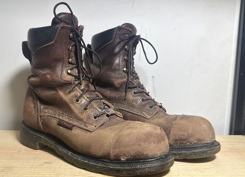 Red Wing 2408 SuperSole 2.0 work boots. Size 9.5 D. 8-inch height provides ankle support. Steel toe rated ASTM F2413-11. Electrical hazard protection included. Nutmeg Ebbtide leather upper. Dual-density SuperSole 2.0 outsole. Made in the USA. Boots show heavy wear and scuffs on leather. Soles have moderate tread wear and debris. Functional work boots ready for the job site.