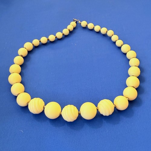 Vintage cream-colored resin bead necklace features a classic graduated design with a mix of smooth and swirled, textured round beads. The pale yellow or tan hue offers a neutral, versatile look that complements both casual and dressy ensembles. Finished with a secure silver-tone spring ring clasp, this piece showcases a timeless mid-century aesthetic. Measurements: • Length: 18" • Largest Bead Diameter: 18mm • Smallest Bead Diameter: 8mm