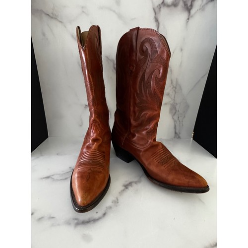 Classic tall western boots crafted from rich cognac brown leather with intricate tonal decorative stitching along the shafts. These cowboy boots feature a pointed toe silhouette, traditional pull-on tabs, and a sturdy block heel for a timeless aesthetic. The shafts are detailed with an embossed star motif and swirling patterns, adding a touch of authentic southwestern flair to the design. Measurements: • Shaft Height: 13" • Heel Height: 1.5" • Total Height: 14.5" Size: 39 approx 8-8.5US