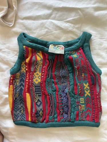 This is a COOGI Australia knitted vest . 100% cotton . I am sure this is a children’s vest because it is so small. It is tagged a size L and fit my child 2T-3T Measurements : laying flat PTP is 12 inches and Lenght is 12 inches . Excellent condition