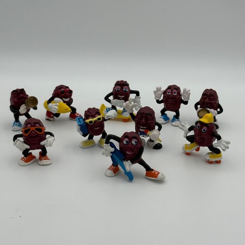 Vintage 1980s California Raisins PVC figure collection featuring a variety of iconic characters in musical and active poses. This nostalgic lot includes raisins playing guitar, saxophone, and trumpet, as well as characters on a skateboard, roller skates, and holding a boombox. Each figure captures the classic claymation style with expressive faces and colorful accessories like sunglasses and sneakers. Perfect for collectors of 80s advertising memorabilia or retro toy enthusiasts. Measurements: • Height: 2" to 3" depending on pose