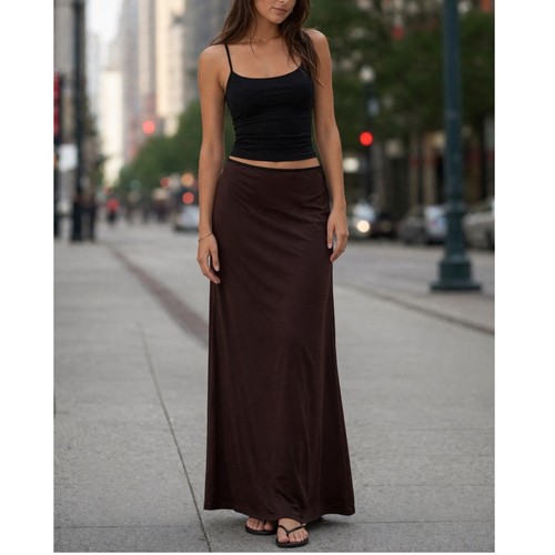 Satin like material. Dark brown with black trim at waistband. Model Off Duty 90s Supermodel 1990s Nineties Y2K 00s 2000s Indie Sleeze Indie Sleaze. Back zipper closure. Made in the USA. Great preowned condition.