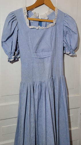 This beautiful, floor-length maxi dress captures a romantic, Victorian aesthetic. Features delicate floral trim on sleeves, and white lace at neck. Defined waist with a gathered, full skirt, ruffled hem, back zipper, short puff sleeves with elasticized cuffs and square neck.