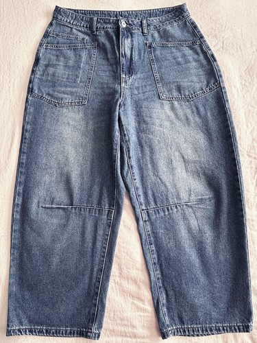 High Waisted. Barrel Horseshoe Jeans. Wide Barrel Leg. Blue Denim. Leg Opening: 9" across. Inseam: 27". Cotton Blend. Rise Back: 18".