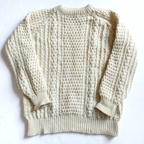 Traditional Aran cable knit, chunky knit. One hole at bottom of sweater, which could be repaired. See LAST photo. Material: 100% new wool. Color: Cream. Crew neckline (lneckline looks small but does stretch).
