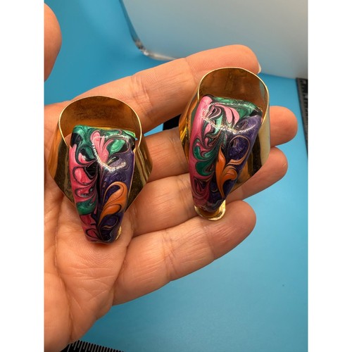 Vintage 1980s clip-on earrings feature a bold, sculptural gold-tone ribbon design accented with a vibrant swirl of multi-color enamel. The psychedelic marbled pattern includes shades of pink, emerald green, purple, and orange, creating a striking contrast against the polished metallic finish. These statement earrings offer a classic retro aesthetic with a secure clip-on closure, perfect for adding a pop of color and vintage flair to any ensemble. Measurements: • Height: 1.75" • Width: 1" All vintage items have normal wear and usage as expected for pieces that existed for decades--please ask questions and review photos, no returns, offers happily accepted, especially when buying multiples <3 <3 <3