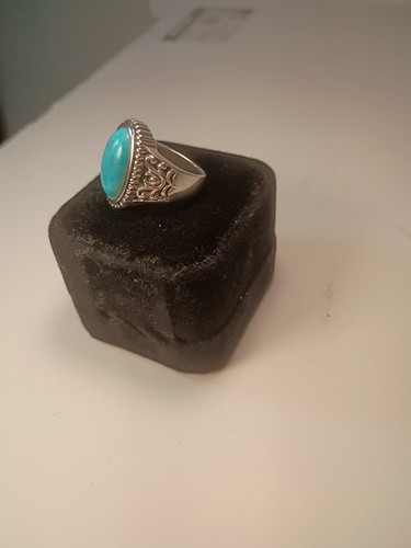The product is a vintage sterling silver turquoise ring in size 7.5. This unique piece of jewelry features a beautiful blue turquoise stone set in sterling silver, giving it a timeless and classic look. The ring is perfect for those who appreciate ethnic, regional, and tribal jewelry, adding a touch of vintage charm to any outfit.