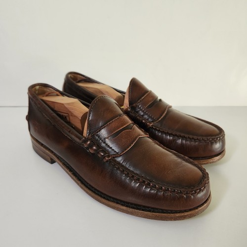Loafers are in excellent condition. Wear on sole but no heal drag. These hand-sewn leather shoes are crafted with a slip-on closure and feature a solid pattern.